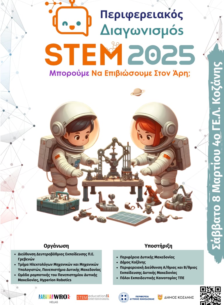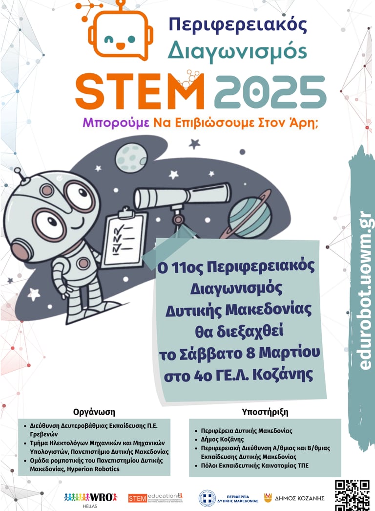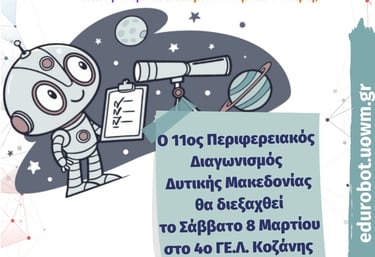 Στα πλαίσια του 11ου Πανελλήνιου Διαγωνισμού Εκπαιδευτικής Ρομποτικής (ΕΡ), με θέμα: «Μπορούμε να επιβιώσουμε στον Άρη;» η Διεύθυνση Δευτεροβάθμιας Εκπαίδευσης Γρεβενών σε συνεργασία με το Τμήμα Ηλεκτρολόγων Μηχανικών και Μηχανικών Υπολογιστών του Πανεπιστημίου Δυτικής Μακεδονίας διοργανώνουν τον 11 ο Περιφερειακό Διαγωνισμό Δυτικής Μακεδονίας. Ο Διαγωνισμός τελεί υπό την αιγίδα του Περιφερειακού Επόπτη Ποιότητας της Εκπαίδευσης Δυτικής Μακεδονίας και πραγματοποιείται με την στήριξη της Περιφέρειας Δυτικής Μακεδονίας, του Δήμου Κοζάνης, των Πόλων Εκπαιδευτικής Καινοτομίας ΤΠΕ της ΠΔΕ, του Συμβούλου Εκπαίδευσης Πληροφορικής Δυτικής Μακεδονίας και του 4 ου Γενικού Λυκείου Κοζάνης.